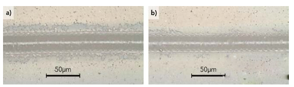 圖2顯示了刻劃產(chǎn)生的碎片和熱影響區(qū),它是在單脈沖和能量相同的情況下使用TimeShift技術(shù)來(lái)創(chuàng)造一個(gè)脈沖串(500mm/s和200kHz)。使用這種技術(shù)的劃刻可以實(shí)現(xiàn)較高的燒蝕質(zhì)量,并且在上表面會(huì)產(chǎn)生較少的碎片,不過(guò)劃刻的深度要比使用單脈沖的深度高出25%。