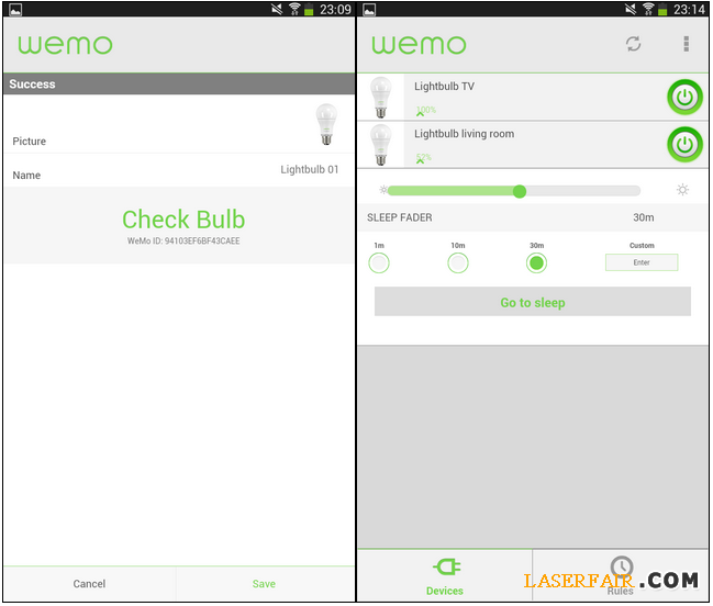 第四步驟,WeMo版面列出的不同燈泡能提供開(kāi)關(guān)、1-100%光暗度、睡眠時(shí)間調(diào)校(Sleep Fader)。另外,于版面的右下角可設(shè)定不同規(guī)則,例如可將燈泡根據(jù)每天日出日落自動(dòng)開(kāi)關(guān),而且能以漸亮漸暗的方式讓用家更易接受,于日落時(shí)開(kāi)啟,日出時(shí)自動(dòng)關(guān)閉,省電節(jié)能。