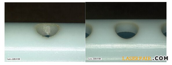 圖2以上對比照片顯示了采用一個355nm納秒級(NS)激光器(左)和一個1030nm飛秒級碟式激光器(右)所鉆成的孔