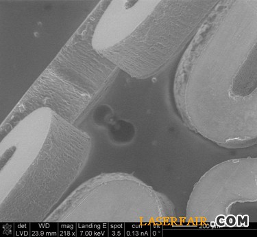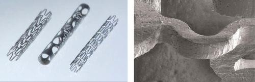 可生物吸收型材料已經(jīng)在歐盟用于冠狀動脈支架,盡管目前還未收到美國食品藥物管理局(FDA)對其在美國使用的批準(zhǔn)。這種材料絕大多數(shù)由聚酯構(gòu)成,主要為聚乳酸和聚乙醇酸的均聚物和共聚物。此材料在各種應(yīng)用領(lǐng)域表現(xiàn)出光明的前景,包括已經(jīng)多次置入支架并因而無法耐受傳統(tǒng)固定支架治療的患者用心血管支架。這種材料目前還用于在插入器官后向身體器官輸送藥物,能以恒定的速率將藥物釋入,且材料最終在預(yù)先制定的時間內(nèi)溶解。圖4所示為一個飛秒級激光器切割可生物降解型支架的示例。