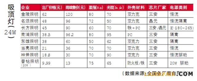 在出廠價格方面,對比球泡燈、T8燈管和T5燈管,出廠價最高的品牌分別為出廠價最低品牌的3.5倍、2.3倍和2.5倍;而對于筒燈、天花燈和導軌燈,各大品牌的出廠價相差較大,價格最高品牌分別為最低品牌的6.3倍、5.6倍和8.2倍。從這些數(shù)據(jù)中看出,在球泡燈、T8燈管和T5燈管中,各品牌價格較為“平均”,相比之下,筒燈、天花燈和導軌燈的各品牌價格相差較大。此外,對于24W家居吸頂燈,出廠價格最高的品牌為金陵,其價格為62元,是神斧的3.2倍之多。而此次調查到的普鉆20W吸頂燈出廠價為9.99元,是24W吸頂燈最低出廠價的神斧的53%,是最高出廠價的金陵24W吸頂燈價格的16%。