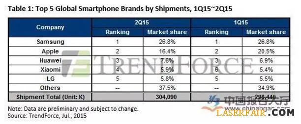調(diào)研機(jī)構(gòu)TrendForce送出了2015年第二季度全球智能手機(jī)報(bào)告公布的數(shù)據(jù)顯示,2015年第二季全球智能手機(jī)出貨量為3.04億部,較上個(gè)季度增長1.9%。而排名前五位的智能手機(jī)制...