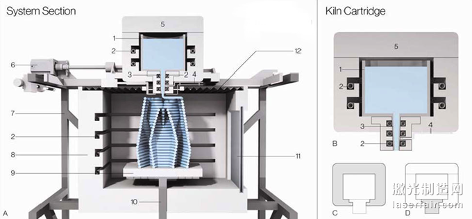 這個(gè)玻璃3D打印機(jī)的工作方式其實(shí)很簡(jiǎn)單。機(jī)器的頂部基本上是一個(gè)小窯,用戶通過(guò)這里把玻璃放進(jìn)去。窯火的溫度能夠升至大約1900華氏度,很容易就將放置在內(nèi)的玻璃熔化。打印機(jī)的下段有一個(gè)氧化鋁—鋯石—二氧化硅材質(zhì)的噴嘴,其功能類似于FDM 3D打印機(jī)中的熱端。窯爐中熔化的玻璃通過(guò)漏斗流下來(lái),并通過(guò)噴嘴擠出到構(gòu)建平臺(tái)上,然后緩慢冷卻變硬。如果使用者想要停止打印玻璃的話,只需使用壓縮空氣降低噴嘴的溫度即可。