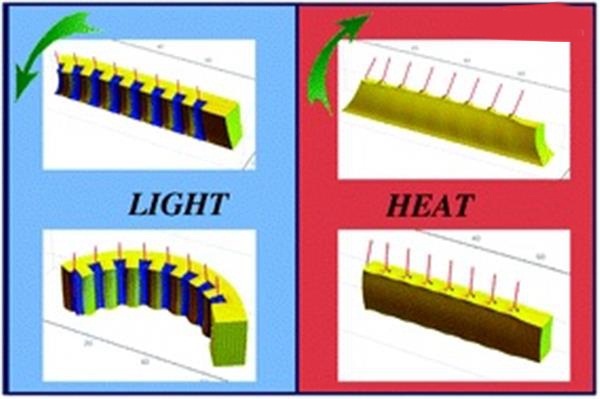 例如,BalazsKuksenok博士發(fā)現(xiàn),當(dāng)被錨定到一個(gè)表面上時(shí),該復(fù)合材料在暴露在光照之下時(shí)會(huì)向一個(gè)方向彎曲,而受到熱刺激的時(shí)候則會(huì)向其它方向彎。當(dāng)與表面分離時(shí),該樣品“在被加熱時(shí)會(huì)像手風(fēng)琴一樣縮小,而被照亮?xí)r又會(huì)像一條毛毛蟲(chóng)那樣卷曲”。這意味著,一個(gè)單一的對(duì)象可以根據(jù)它所變形的形狀而實(shí)現(xiàn)不同的功能,而且它的行為是完全可編程、可預(yù)見(jiàn)和多方面的。