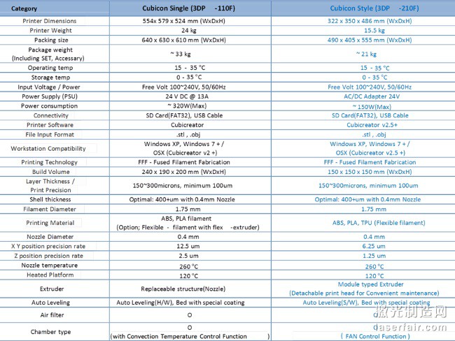 HyVision同時(shí)推出的另外一款3D打印機(jī)則是更加成熟的Cubicon Single3DP-110F),這是一款大尺寸的專業(yè)級(jí)3D打印機(jī),可支持ABS/PLA材料,其打印尺寸也更大,最大可達(dá)24×19×20厘米。據(jù)稱其使用了韓國(guó)首個(gè)自行設(shè)計(jì)的可更換擠出機(jī),并擁有類似于Style的打印床自動(dòng)找平功能。