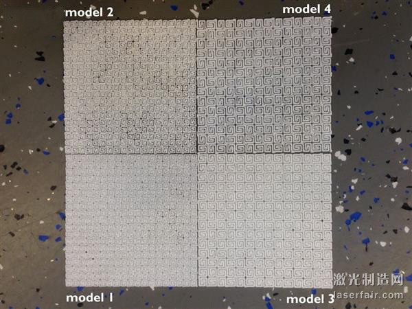 Kromhout介紹說(shuō),其中的每個(gè)原型都包括兩個(gè)變量——基本結(jié)構(gòu)圖案(或者叫花紋)的尺寸和花紋內(nèi)部線條之間的空隙,研究團(tuán)隊(duì)會(huì)通過(guò)調(diào)整這兩個(gè)變量來(lái)測(cè)量其對(duì)3D打印對(duì)象柔性的影響。此外,對(duì)象的厚度保持不變。于是,在這兩個(gè)變量的基礎(chǔ)上組合而成了四種不同的模型:模型1——小花紋尺寸和小空隙;模型2——小花紋尺寸大空隙;模型3——大花紋尺寸小空隙;模型4——大花紋尺寸大空隙。