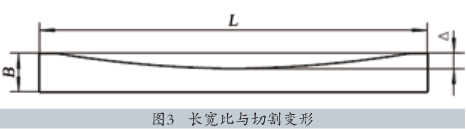 對(duì)于長(zhǎng)寬比(L/B)較大的板類(lèi)工件,隨著比值和工件厚度的不同,零件會(huì)出現(xiàn)變形,如圖3所示的切割缺陷,這對(duì)這種缺陷,應(yīng)根據(jù)板材的材質(zhì)不同,所采取的切割方法也不同。