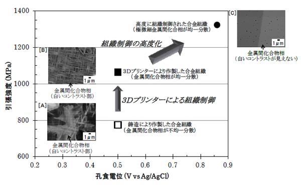 圖1:鑄造、使用金屬3D打印機的以往方法和新方法在合金組織及特性方面的比較