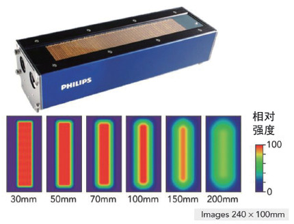圖1展示了一個激光模塊從40×208mm表面發(fā)射輸出功率為9.6kW的光束。VCSEL模塊發(fā)出的光不需要進(jìn)一步使用光學(xué)元件,它本身就非常均勻。右邊顯示的是光強分布和發(fā)射器與目標(biāo)之間距離的關(guān)系。在距離達(dá)到100mm之前,光強分布保持得非常均勻。由于光束由數(shù)以百計的芯片組組成,所以可以單獨處理,從而有可能產(chǎn)生動態(tài)變化的光束分布。