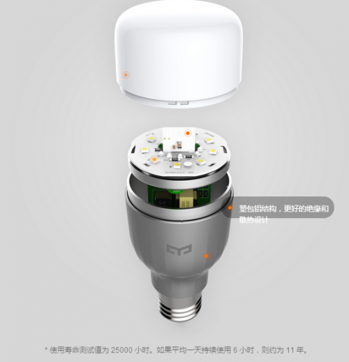 Yeelight智能燈彩光版選用德國(guó)歐司朗高品質(zhì)LED燈珠,白色燈珠顯色指數(shù)在80以上。其9W低功耗可實(shí)現(xiàn)600流明,相當(dāng)于60W白熾燈的等效照度。假設(shè)每天點(diǎn)亮3小時(shí),燈泡可持續(xù)使用11年。防摔方面,1米落到木質(zhì)地板上不破碎。
