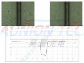 我們需要實(shí)現(xiàn)膜上凹槽不同寬度(50、200和1000um)。以最好的工藝參數(shù),我們處理特定的包含3個(gè)凹槽的刻線模式,長度100mm;相鄰間隔6mm、依次翻倍即12mm、24mm。3個(gè)凹槽組成的每組之間間隔為10 mm。