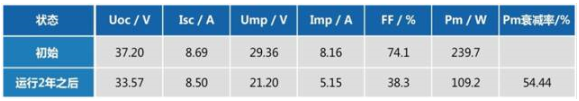 在走訪一些潮濕環(huán)境的光伏發(fā)電系統(tǒng)過程中,一個(gè)經(jīng)常被提到的問題是光伏發(fā)電系統(tǒng)運(yùn)行一段時(shí)間后,發(fā)電量下降明顯,導(dǎo)致電站收益大幅降低,嚴(yán)重?fù)p害了業(yè)主的利益。經(jīng)現(xiàn)場(chǎng)測(cè)試發(fā)現(xiàn),多個(gè)光伏發(fā)電系統(tǒng)在建成一至兩年后,有的背板組件功率大幅衰減(見表1),部分背板組件功率衰減高達(dá)50%以上,而組件功率衰減正是導(dǎo)致光伏系統(tǒng)發(fā)電量下降的重要原因之一。