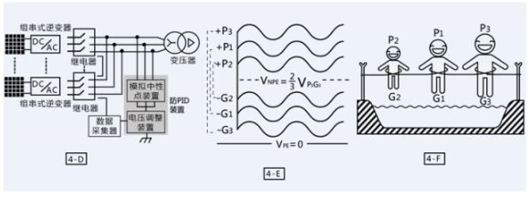 負(fù)極虛擬接地方案是陽光電源首創(chuàng)并具有發(fā)明專利的方案,對(duì)預(yù)防光伏電站得“風(fēng)濕病”效果顯著。陽光電源每臺(tái)集中式逆變器交流側(cè)都會(huì)配套一個(gè)PID防護(hù)模塊,包括電壓調(diào)整裝置和模擬中性點(diǎn)裝置,通過電路結(jié)構(gòu)構(gòu)造與直流側(cè)中點(diǎn)電位相等的等效中性點(diǎn),電壓調(diào)整裝置將等效點(diǎn)電位抬升時(shí),組件負(fù)極對(duì)地電壓相應(yīng)高于地面電壓,達(dá)到負(fù)極虛擬接地目的(如圖3)。
