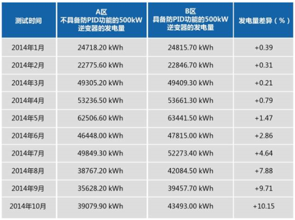 以某實(shí)際電站為例,選取此電站同一地點(diǎn)、各種條件基本相同的兩個(gè)光伏方陣,其中A區(qū)采用不具備防PID功能的集中式逆變器,B區(qū)采用陽光電源具備防PID功能的集中式逆變器。經(jīng)過統(tǒng)計(jì)發(fā)現(xiàn),安裝PID防護(hù)模塊的集中式逆變器可以有效地防止組件PID衰減,相對(duì)于不具備防PID功能的方陣,10個(gè)月后,具備防PID功能的方陣發(fā)電收益提升超過10%,且提升幅度隨著時(shí)間會(huì)逐步增加(見表2)。