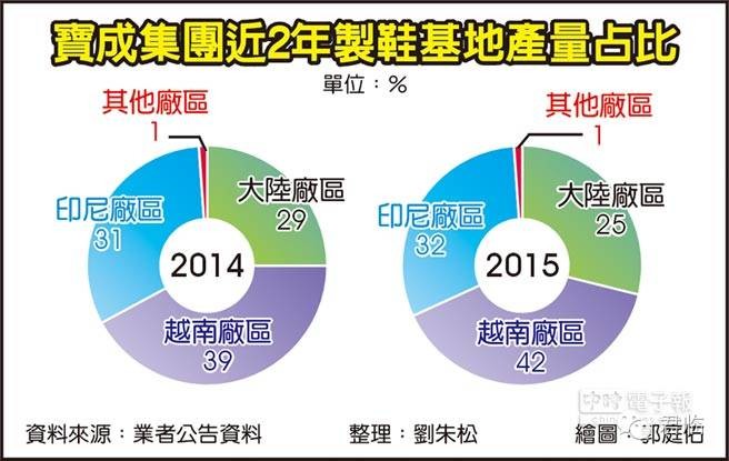 現(xiàn)在的寶成,有員工41萬人,分布在中國、越南、印尼三大廠區(qū)。就產(chǎn)量份額來說,2015年中國的比例已經(jīng)是三大廠區(qū)中最小的一塊了,只剩下越南的一半左右。