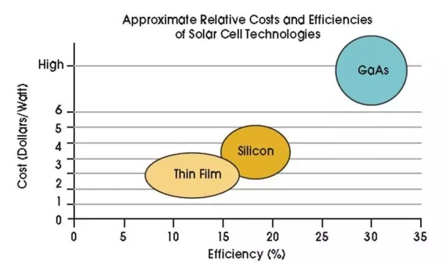 目前商業(yè)化應(yīng)用有三種常見(jiàn)的太陽(yáng)能電池技術(shù):多結(jié)電池,晶硅電池和薄膜電池。多結(jié)電池通過(guò)在單晶基片上應(yīng)用化學(xué)氣相沉積技術(shù)而制備,擁有最高的電子轉(zhuǎn)換效率(一般28-29%,甚至可達(dá)40%)。由于生產(chǎn)成本非常昂貴,它們通常用于不計(jì)成本或者有效面積較小的應(yīng)用,如衛(wèi)星或太陽(yáng)能集中器。晶硅電池的應(yīng)用最為廣泛,單晶或者多晶硅的效率大致是13%22%范圍。薄膜電池是一種新技術(shù),具有相對(duì)較低的效率(8-18%)和較低的生產(chǎn)成本。