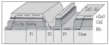P3 :制備前電極、窗口層,并對(duì)該層薄膜進(jìn)行劃線,要求將前電極層和吸收層全部去除,但不損壞背電極Mo和襯底,以實(shí)現(xiàn)電池的分離。