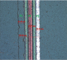 P1:在基板上制備好背電極Mo(一般采用磁控濺射的方法)之后,對(duì)其進(jìn)行劃線,即將基板上面的Mo電極進(jìn)行分割,要求刻蝕掉Mo層,但不損壞襯底PI,使其后續(xù)作為子電池,便于串聯(lián)。