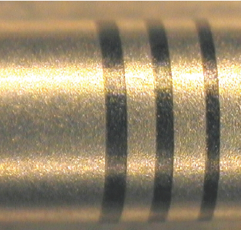 醫(yī)療器械行業(yè)所要求的標(biāo)記風(fēng)格被稱為“深色標(biāo)記或退火標(biāo)記。”該標(biāo)記不會從部件上去除任何材料,因而避免了任何污染物聚積的潛在可能性。當(dāng)處理部件時,深色或退火標(biāo)記一定不能被材料表面所感知到。圖1顯示的是醫(yī)療設(shè)備上常使用的深色型標(biāo)記。