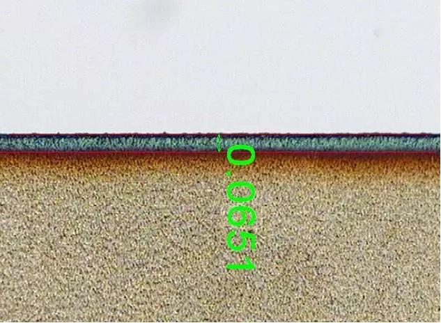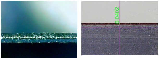 負極極片中間為銅箔,兩邊為電鍍石墨層,切縫層次分明,邊緣平整,無熔珠,熱影響區(qū)域小于0.051mm厚度80μm