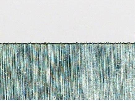 拉絲面鋁箔厚度40μm,切縫毛刺約0.007mm。熱影響區(qū)小于0.01mm