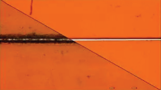 圖1:CO2激光(左)與 UV 激光(右)的切割槽比較。UV 激光產生熱效應較小,其切割邊沿干凈、整齊。
