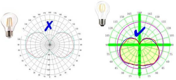 直絲 LED 燈絲燈的配光曲線圖成蝴蝶斑,打開直絲LED 燈絲燈,其燈下中間會呈現(xiàn)暗區(qū)而周圍明亮。而弧絲LED 燈絲燈的配光曲線圖呈滿月狀,弧絲LED燈絲燈下面不會有光的暗區(qū)。