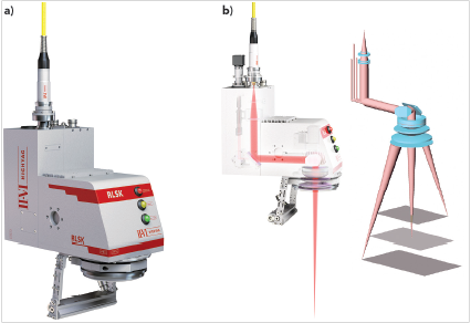 圖2 : I I - V I HIGHYAG 推出的基于振鏡結構的3D 遠程激光焊接頭RLSK(a),以及其剖面圖和作用原理(b)