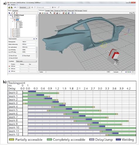 圖4:使用RLSK Studio 軟件可以按照時間表(b),視覺觀察對焦定位(a) 和焊接加工,實現(xiàn)用戶友好的工藝控制。該時間表顯示,各次施焊之間只存在最低程度的時間間隔損失( 藍色部分) 從而最大程度提高了生產(chǎn)效率。