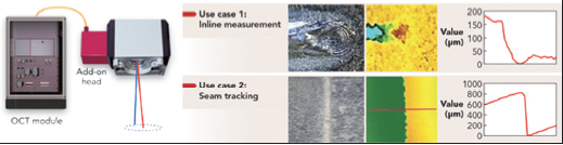 掃描振鏡技術(shù)不斷取得進(jìn)展,持續(xù)增強(qiáng)了焊接工藝的可見性和控制性。就這一領(lǐng)域而言,光學(xué)相干斷層掃描(OCT)技術(shù)有望實(shí)現(xiàn)下一個(gè)飛躍,因?yàn)樗且环N在千赫茲的頻率范圍在微米尺度上收集距離數(shù)據(jù)的單點(diǎn)測(cè)量方法。原則上來(lái)說(shuō),它是一種干涉儀裝置,其中一個(gè)光束路徑(測(cè)量臂)指向工件,第二道光束路徑(參考臂)具有已知長(zhǎng)度。這種傳感器在固定式激光光學(xué)頭中的最先進(jìn)的應(yīng)用近來(lái)已被引入市場(chǎng)。該干涉儀使用了一款近紅外波長(zhǎng)范圍以及光纖耦合光束傳輸?shù)某椛浒l(fā)光二極管(SLD)。