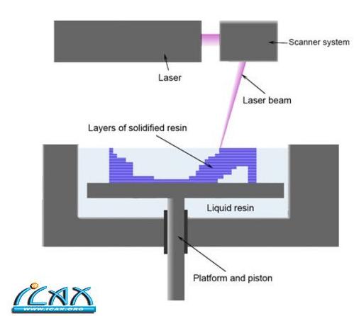 工藝原理:先由軟件把3D的數(shù)字模型,“切”成若干個(gè)平面,這就形成了很多個(gè)剖面,在工作的時(shí)候,有一個(gè)可以舉升的平臺(tái),這個(gè)平臺(tái)周?chē)幸粋€(gè)液體槽,槽里面充滿(mǎn)了可以紫外線(xiàn)照射固化的液體,紫外線(xiàn)激光會(huì)從底層做起,固化最底層的,然后平臺(tái)下移,固化下一層,如此往復(fù),直到最終成型。