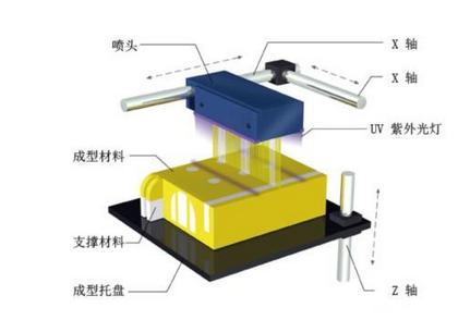 工藝原理:沿著X軸前后滑動(dòng),在成型室里鋪上一層超薄的光敏樹(shù)脂。每鋪完一層后,噴頭架邊上的紫外光球立即發(fā)射紫外光,快速固化和硬化每層光敏樹(shù)脂。該步驟減少了使用其他技術(shù)所需的后處理過(guò)程。每打印完一層,機(jī)器內(nèi)部的成型底盤(pán)就會(huì)極為精確地下沉,而噴頭繼續(xù)一層一層地工作,直到原型件完成。成型時(shí)使用了兩種不同的光敏樹(shù)脂材料:一種是用來(lái)成型實(shí)體部件的成型材料,另一種類(lèi)膠體的用來(lái)支撐部件的支撐材料。