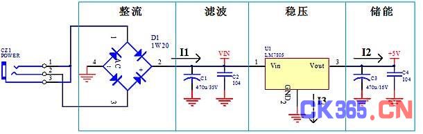 從圖上可知,線性電源有整流、濾波、穩(wěn)壓、儲能等功能元件組成,同時,一般用的線性電源為串聯(lián)穩(wěn)壓電源,輸出電流等于輸入電流,I1=I2+I3,I3是參考端,電流很小,因此I1≈I3。我們?yōu)槭裁匆v電流,是因?yàn)镻CB設(shè)計時,每條線的寬度不是隨便設(shè)的,是要根據(jù)原理圖里元件節(jié)點(diǎn)間的電流大小來確定的(請查《PCB設(shè)計銅鉑厚度、線寬和電流關(guān)系表》)。電流大小、電流流向要搞清楚,做板才恰到好處。