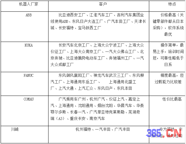 汽車領(lǐng)域的工業(yè)機(jī)器人,除了四大家族外,還有意大利菲亞特克萊斯勒旗下的COMAU(柯馬)、日本的NACHI(那智不二越,為奇瑞提供108臺(tái)機(jī)器人)、日本的川崎重工、韓國(guó)的現(xiàn)代重工值得一提??埋R在白車身領(lǐng)域全球第二。韓國(guó)羅普伺達(dá)、阿爾帕也為現(xiàn)代汽車提供機(jī)器人。此外日本有些廠家如豐田旗下的電裝也有能力自制工業(yè)機(jī)器人。