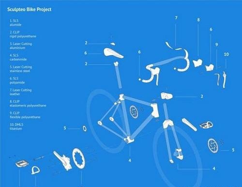 如自行車分解圖顯示,其70%的零部件由激光3D打印而成,自行車腳踏曲柄是鋁合金激光切割技術(shù),握把套則是皮革激光切割技術(shù)。利用激光技術(shù),當(dāng)某些零件性能不足而損壞時,兩位設(shè)計師了解到第一手資料并調(diào)整設(shè)計和材質(zhì),從而快速生產(chǎn)出最佳的自行車零配件。