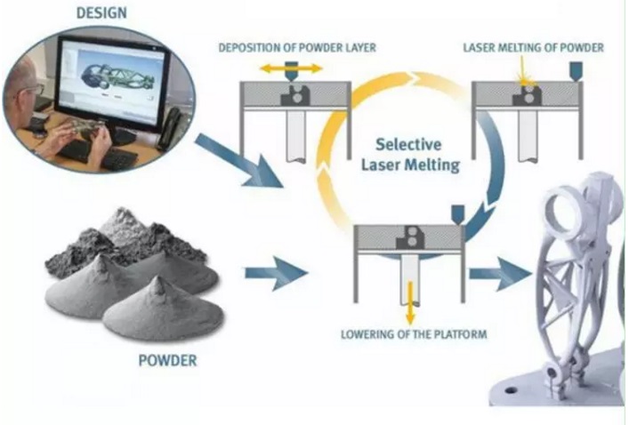 使用高功率激光束將一層金屬粉末加工熔合成型,完成熔合后,操作平臺下調一個層厚的距離,繼續(xù)加工下一層粉末,重復此步驟,直至劃定(選定的需要加工)的區(qū)域全部熔鑄完成,就得到一件立體的化合物。所需的產品(零件)就是這樣通逐層加工累積而成。