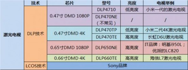 激光電視與液晶電視一樣,無一例外需要芯片的支撐才是質(zhì)量的保障。芯片的選擇上,幾乎所有激光電視是使用DLP技術(shù)的DMD芯片,它主要分為四個尺寸:0.47寸DMD 1080P,0.47寸DMD 4K,0.65寸DMD 1080P和0.66寸DMD 4K,不同芯片的型號也決定了投影的性能。
