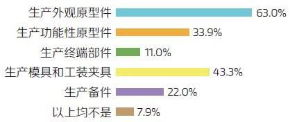 然而,面對“3D打印對于哪些應(yīng)用已經(jīng)成熟”這個問題時,回答主要集中在生產(chǎn)外觀原型件(63%)、生產(chǎn)功能性原型件(33.9%)、生產(chǎn)模具和工裝夾具(43.3%)上,僅有11%的受訪者認可3D打印是一種成熟的生產(chǎn)終端部件的方式。可見,雖然多數(shù)受訪者將3D打印視作一種補充性制造技術(shù),但仍將其作用局限于對傳統(tǒng)制造的局部流程進行替代和改進。