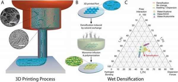 蘇黎世聯(lián)邦理工學(xué)院A.R. Studart教授課題組將3D打印技術(shù)與濕法致密化工藝相結(jié)合,極大提高了材料中纖維素的濃度,3D打印復(fù)合材料顯示出了高度有序的微觀結(jié)構(gòu)和顯著增強(qiáng)的機(jī)械性能,其性能明顯高于已報(bào)道的3D打印纖維素基材料。相關(guān)工作以“Complex-Shaped Cellulose Composites Made by Wet Densification of 3D Printed Scaffolds”為題,發(fā)表于《先進(jìn)功能材料》上。復(fù)合材料的制備過(guò)程研究人員采用兩步法來(lái)制備具有高納米纖維濃度的復(fù)雜結(jié)構(gòu)復(fù)合材料:首先打印具有高度有序微觀結(jié)構(gòu)的纖維素支架,隨后是通過(guò)溶劑置換過(guò)程對(duì)打印支架進(jìn)行濕致密化(圖1)。所打印的油墨由纖維素納米晶與纖維素兩部分組成,研究人員引入盡可能高的纖維素納米晶來(lái)實(shí)現(xiàn)打印支架中纖維素的濃度最大化,擠出過(guò)程則使得纖維素納米晶定向排列(圖1A);隨后,將打印物體浸入選定成分的溶劑浴中,使纖維素支架致密化(圖1B),當(dāng)溶池中的液體是纖維素的不良溶劑時(shí),會(huì)導(dǎo)致纖維素之間相互吸引,實(shí)現(xiàn)致密化;研究人員還利用文獻(xiàn)報(bào)道的Hansen溶解度參數(shù)來(lái)評(píng)估了相應(yīng)的溶劑量(圖1C)。
