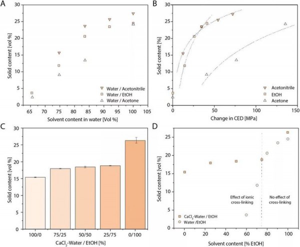 圖1. 3D打印和濕法致密化工藝示意圖 研究人員系統(tǒng)地研究了溶劑組成對(duì)致密化過(guò)程的影響,當(dāng)將支架浸入濃度不斷增加的乙醇、丙酮或乙腈的水溶液中時(shí),支架會(huì)不斷致密化(圖2A)。以水和乙醇的混合物為例,隨著乙醇的比例從65.5增加到100 vol%,可以觀察到固體體積分?jǐn)?shù)從3.67改變?yōu)?4.5vol%。根據(jù)實(shí)驗(yàn)數(shù)據(jù),可以在溶解度圖中定義一個(gè)能夠分散或者致密化纖維素支架的區(qū)域(圖1C中的綠色區(qū)域)。 為了更好地定量濕法致密化過(guò)程的物理過(guò)程,研究人員用纖維素的內(nèi)聚能密度(CED)與不同溶劑混合物的內(nèi)聚能密度進(jìn)行了解釋。由于水解纖維素的CED與水相當(dāng),但高于純乙醇、丙酮和乙腈(圖2B),因此將這些非水溶劑添加到液體混合物中將有利于纖維素納米粒子之間的相互吸引。此外,還可使用交聯(lián)劑離子(如Ca 2+)來(lái)增加打印纖維素制件的固體含量。Ca 2+離子和水解的纖維素納米顆粒之間存在靜電作用,減小了納米纖維素相互間的距離,從而增加了固體含量。通過(guò)將乙醇添加到含Ca 2+的水溶液中,Ca 2+的交聯(lián)作用可以與溶劑誘導(dǎo)的致密化作用相結(jié)合(圖2C)。對(duì)于含Ca 2+浴中的乙醇濃度高于70.4 vol%的情況,其固形物的含量可與使用無(wú)Ca 2+的水-乙醇混合物獲得的濃度相當(dāng)(圖2C,D)。