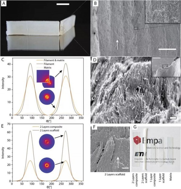 圖2. 使用不同混合溶劑獲得的纖維素支架的固體含量復(fù)合材料和力學(xué)性能將經(jīng)過(guò)濕法致密化處理的3D打印納米纖維素制件進(jìn)一步加工成含有高濃度纖維素的復(fù)合材料。在纖維素支架中引入聚合物相來(lái)制備復(fù)合材料:先對(duì)打印材料超臨界干燥處理,再以單體滲透打印材料。3D打印后進(jìn)行濕法致密化可以保留纖維素納米晶和納米纖維的定向排列(圖3A,B);廣角X射線衍射驗(yàn)證了纖維素沿打印方向的高度有序排列,掃描電鏡照片也進(jìn)一步觀察到了纖維素的取向結(jié)構(gòu)(圖3C–F)。由于所選的聚合物具有與纖維素納米顆粒相似的折射率,最終可獲得透明的復(fù)合材料(圖3G)。