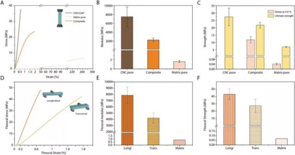 圖3纖維素基長(zhǎng)絲和打印物體在用聚合物滲透前后的結(jié)構(gòu)表征 通過(guò)控制纖維素的排列以及在納米纖維和聚合物基體之間形成牢固的界面,可以制備具有可調(diào)各向異性機(jī)械性能的半透明纖維素基3D打印復(fù)合材料(圖4)。拉伸測(cè)試結(jié)果表明該聚合物基體非常柔軟和脆弱,而摻入27.35 vol%的納米纖維素顆??蓪⒉牧系哪A亢蛷?qiáng)度提高幾個(gè)數(shù)量級(jí)(圖4A–C)。利用彎曲測(cè)試研究了納米纖維素排列和絲間粘附對(duì)復(fù)合材料機(jī)械性能的影響,結(jié)果表明,納米纖維素與施加的應(yīng)力平行排列的復(fù)合材料的彎曲模量為7.9 GPa,比垂直方向下測(cè)試的樣品高出兩倍。反映了打印纖維素之間的高粘附力,同時(shí)表明,即使垂直于主應(yīng)力方向排列,納米纖維素也能夠增強(qiáng)聚合物基體。通過(guò)濕法致密化過(guò)程獲得的高濃度的纖維素,其增強(qiáng)效果明顯強(qiáng)于文獻(xiàn)報(bào)道過(guò)的基于纖維素的3D打印復(fù)合材料(圖4D–F)