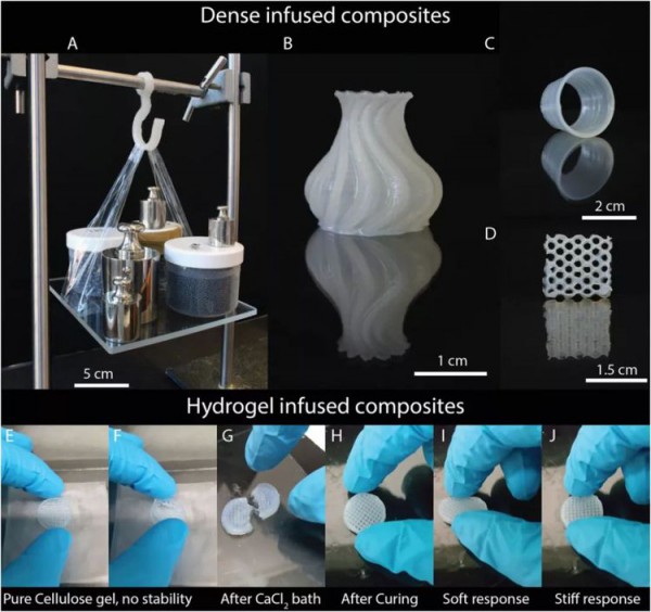 圖4 3D打印復(fù)合材料的機(jī)械性能 研究人員打印出了具有懸垂和不對(duì)稱(chēng)特征的復(fù)雜形狀的罐子、中空的截錐和蜂窩等多種復(fù)雜結(jié)構(gòu)(圖5A–D)。研究人員還打印了一個(gè)鉤子,該鉤子可以承受的載荷比其自重高737倍,沒(méi)有出現(xiàn)明顯的伸展或破裂(圖5A)。高濃度的納米纖維素可以用來(lái)打印堅(jiān)硬的承重結(jié)構(gòu),而在纖維素含量較低時(shí),可以制備與Ca 2+交聯(lián)并在水中溶脹的油墨,設(shè)計(jì)出具有定制的宏觀幾何形狀的軟水凝膠和機(jī)械響應(yīng)能力(圖5E–J)。