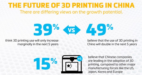 調(diào)查顯示,40%的受訪者認(rèn)為3D打印有可能擾亂全球的商品分銷模式。有一半的中國(guó)制造商認(rèn)為,隨著AM在全球范圍內(nèi)得到越來(lái)越多的采用,它將挑戰(zhàn)中國(guó)在制造業(yè)中的領(lǐng)先地位。不過(guò),這并不意味著中國(guó)的3D打印使用率不會(huì)上升——49%的受訪者認(rèn)為,在未來(lái)五年內(nèi),中國(guó)采用3D打印的比例將增加一倍(也有39%的受訪者表示,3D打印的使用只會(huì)略有增加。)。