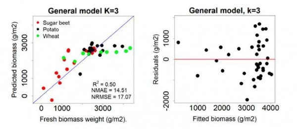 該研究利用3DPI算法估算生物量,利用每平方米可變數(shù)量最高點(diǎn)的平均高度估算作物高度。結(jié)果得出,利用該方法可以準(zhǔn)確估計(jì)甜菜(R2= 0.68,RMSE = 17.47 g / m2)和冬小麥(R2= 0.82,RMSE = 13.94 g / m2)的生物量。同時(shí),也可以準(zhǔn)確估計(jì)甜菜(R2= 0.70, RMSE = 7.4 cm)和冬小麥(R2= 0.78, RMSE = 3.4 cm)的作物高度。然而,馬鈴薯株高(R2=0.50,RMSE=12cm)和生物量估算(R2=0.24,RMSE=22.09g/m2),由于其復(fù)雜的冠層結(jié)構(gòu)和種植馬鈴薯的壟狀結(jié)構(gòu),其可靠性較差。最后,本文還指出,通常情況下,對于利用該方法進(jìn)行精準(zhǔn)生物量和作物高度估計(jì),飛行條件(高度、速度、飛行路線的位置)應(yīng)該與校準(zhǔn)模型的設(shè)置相當(dāng),因?yàn)樽兓臈l件會對估計(jì)的作物生物量和株高產(chǎn)生強(qiáng)烈影響。