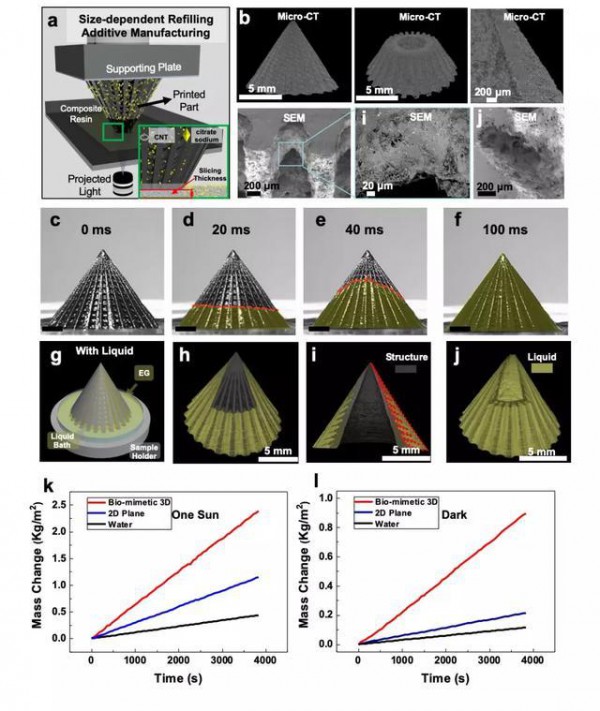 1 3D結(jié)構(gòu)蒸發(fā)器的制備及其增強(qiáng)水蒸發(fā)速率的應(yīng)用。a, 連續(xù)DLP 3D打印系統(tǒng)制備3D結(jié)構(gòu)的示意圖。b, 3D蒸發(fā)器的Micro-CTSEM表征。c–f, 3D蒸發(fā)器表面超快水鋪展過(guò)程。g-j, 3D蒸發(fā)器的表面束縛的水膜結(jié)構(gòu)。k, 一個(gè)模擬太陽(yáng)光照射下3D蒸發(fā)器表面水的揮發(fā)速率,同時(shí)以純水和2D平面作為對(duì)照。l, 3D蒸發(fā)器表面暗場(chǎng)下水的揮發(fā)速率,同時(shí)以純水和2D平面作為對(duì)照。