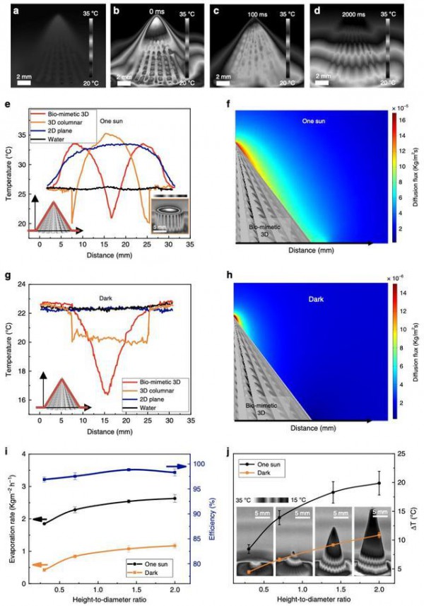 2 3D結(jié)構(gòu)的作用機(jī)理。a, 暗場(chǎng)下3D蒸發(fā)器表面的紅外圖像。b-c, 水向上擴(kuò)散過(guò)程中的紅外圖像。d, 水在3D結(jié)構(gòu)表面蒸發(fā)達(dá)到動(dòng)態(tài)平衡的紅外圖像。e, 在一個(gè)模擬太陽(yáng)光照射下,3D錐形蒸發(fā)器(紅線)、3D柱狀結(jié)構(gòu)(橙色線)、2D平面(藍(lán)線)和純水(黑線)表面的溫度曲線。f, 一個(gè)模擬太陽(yáng)光照射下,水/蒸汽界面處的蒸汽擴(kuò)散通量的數(shù)值模擬。g, 在暗場(chǎng)下,3D錐形蒸發(fā)器(紅線)、3D柱狀結(jié)構(gòu)(橙色線)、2D平面(藍(lán)線)和純水(黑線)表面的溫度曲線。h, 暗場(chǎng)下水/蒸汽界面處的蒸汽擴(kuò)散通量的數(shù)值模擬結(jié)果。i, 3D結(jié)構(gòu)的高徑比對(duì)水的蒸發(fā)速率和太陽(yáng)能利用效率的影響。j, 3D結(jié)構(gòu)的高徑比對(duì)熱毛細(xì)流的影響。