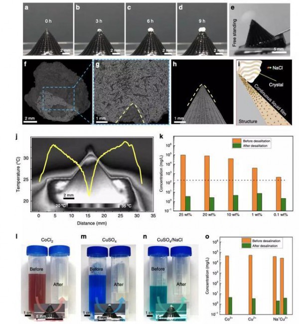 3 3D結(jié)構(gòu)表面鹽的頂部定位結(jié)晶特性。a–d, 3D結(jié)構(gòu)表面的定位結(jié)晶過(guò)程。e, 定位結(jié)晶的鹽可通過(guò)傾斜蒸發(fā)器去除。f, 去除的NaCl晶體的Micro-CT底部圖像。g, 去除的NaCl晶體的側(cè)面橫截面Micro-CT圖像。h, 3D蒸發(fā)器頂部位置的Micro-CT圖像。i, 沿3D結(jié)構(gòu)側(cè)壁的連續(xù)水膜與NaCl晶體內(nèi)部連通的示意圖。j, 頂部發(fā)生鹽定位結(jié)晶后3D結(jié)構(gòu)側(cè)壁的溫度曲線,插圖是相應(yīng)的紅外圖像。k, 不同初始濃度的鹽水在使用3D結(jié)構(gòu)淡化后的Na+濃度。橙色和綠色列分別代表純化之前和之后的 Na+濃度。虛線是WHO對(duì)飲用水中Na+的濃度標(biāo)準(zhǔn)。l–n, 3D結(jié)構(gòu)凈化不同鹽溶液前后的光學(xué)照片。o, 純化前后的相應(yīng)金屬離子濃度,對(duì)應(yīng)l-n中的樣品。
