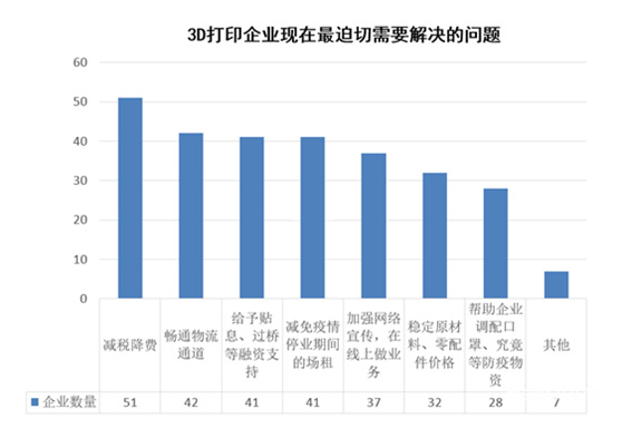 5. 在3D打印企業(yè)現(xiàn)在最迫切需要解決的問題上,企業(yè)反映最多的是減稅降費(fèi),在這方面政府可以有所作為,比如稅收返還、延遲扣繳社保公積金等;同時(shí),暢通物流通道;給予貼息、過橋等融資支持;減免疫情停業(yè)期間的場(chǎng)租成為企業(yè)比較迫切需要解決的問題。