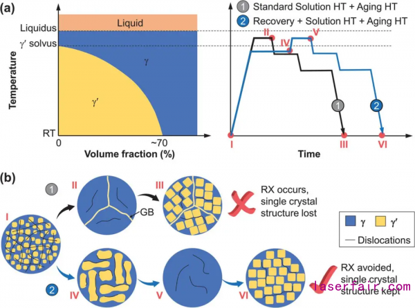 高溫合金的標準熱處理制度一般由固溶、時效組成。實踐證明該工藝流程會導致3D打印高溫合金發(fā)生再結(jié)晶。經(jīng)過系統(tǒng)的文獻調(diào)研與綜合分析,作者們提出并證實在固溶前增加“回復(fù)”(Recovery)步驟,可以消除再結(jié)晶驅(qū)動力。經(jīng)過“回復(fù)-固溶-時效”處理,先是高溫合金的殘余應(yīng)力伴隨微觀組織γ′相的定向粗化而消除,且位錯密度可降低至熱處理前的5%左右,時效后沉淀強化γ′相達到與鑄態(tài)基材相同水平。因所發(fā)現(xiàn)的現(xiàn)象與高溫合金在高溫蠕變條件下發(fā)生的筏化效應(yīng)(Rafting)相似,且在事實上起到了回復(fù)的效果,故將其命名為“筏化-回復(fù)”效應(yīng)(Rafting-enabled recovery)。此發(fā)現(xiàn)突破了經(jīng)典觀念所認為的“單晶高溫合金不具備回復(fù)能力”的認知,為設(shè)計3D打印高溫合金的非標準熱處理制度提供了科學依據(jù),并表明新的熱處理制度完全能滿足3D打印單晶葉片修復(fù)的需求。